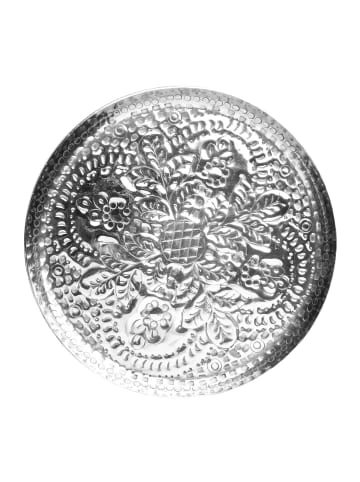Sie servieren warmen Minztee oder dekorieren es mit Kerzen. Mit dem Oriental Lounge-Platzteller stimmt auf jeden Fall das Drumherum. Vorsichtige Reinigung mit einem feuchten Tuch und einem milden Spülmittel möglich. – Zum servieren oder dekorieren – Lieferumfang: 1x Oriental Lounge Deko-Teller – In unterschiedlichen Varianten erhältlich. – Aus Aluminium, vernickelt – Höhe 3 cm, Ø 36,5 cm