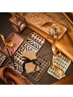 In einem raffinierten Schmelzvorgang entsteht die wunderschöne Emaille-Oberfläche des Pattery Dekotablett Aluminium. Das grafische Muster wird von einer Kante in Gold gerahmt, woraus ein moderner und zugleich eleganter Look entsteht. Sie nutzen das außergewöhnliche Tablett z.B. für Nüsse und Tannenzapfen, als Schmuckablage oder als dekorativen Hingucker im Bad. Mit Pads an der Unterseite zum Schutz empfindlicher Oberflächen. In verschiedenen Farben und Größen erhältlich, ideal auch zum Kombinieren.