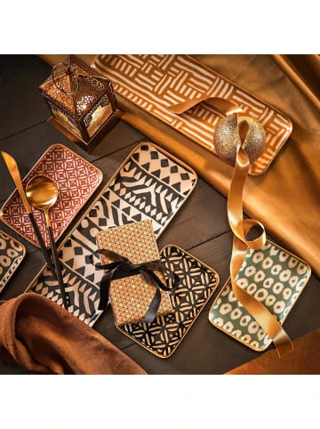 In einem raffinierten Schmelzvorgang entsteht die wunderschöne Emaille-Oberfläche des Pattery Dekotablett Aluminium. Das grafische Muster wird von einer Kante in Gold gerahmt, woraus ein moderner und zugleich eleganter Look entsteht. Sie nutzen das außergewöhnliche Tablett z.B. für Nüsse und Tannenzapfen, als Schmuckablage oder als dekorativen Hingucker im Bad. Mit Pads an der Unterseite zum Schutz empfindlicher Oberflächen. In verschiedenen Farben und Größen erhältlich, ideal auch zum Kombinieren.