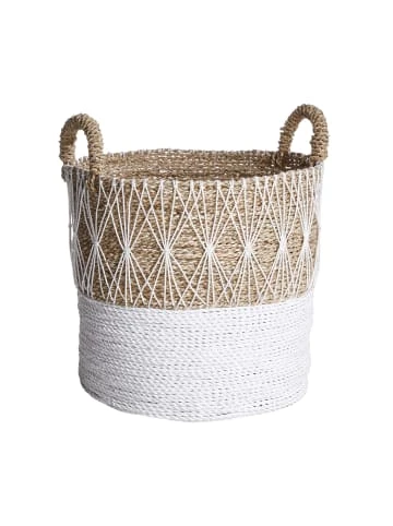 Boho-Stil und Strandfeeling – das macht den Look des White Beach Korbs mit Griffen aus. Er ist aufwändig aus den Naturmaterialien Pandanus und Baumwolle gearbeitet, als weiteres Material kommt Kunststoff hinzu. Seine besondere Optik erhält der Korb durch die Farben Natur und Weiß sowie durch die fein gespannten Fäden, die an Stickereien oder Makramee erinnern. Da suchen Sie doch gleich nach einer leichten Decke oder anderen Sommeraccessoires, die sich dekorativ verstauen lassen. Tipp: Kann auch anstelle eines Übertopfes für Pflanzen verwendet werden. Weitere Größen erhältlich, ideal auch zum Kombinieren.