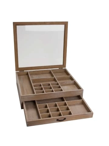 Muscheln, Edelsteine, Fossilien, Fingerhüte, Miniaturfiguren – es gibt so viele Kleinigkeiten, für die sich das Sammlerherz begeistern kann. Gut aufgehoben und schön präsentiert sind Ihre Lieblingsobjekte in diesem Setzkasten. Er enthält zwei Ebenen, beide in verschieden große Fächer unterteilt. Die obere Ebene ist durch einen Glasdeckel (zum Klappen) geschützt, die untere lässt sich wie eine Schublade herausziehen. Damit erinnert der Setzkasten an die Ausrüstung, mit deren Hilfe die Forscher früher ihre Schätze archivierten. – Einfarbig – Vintage