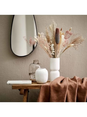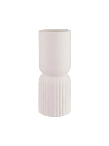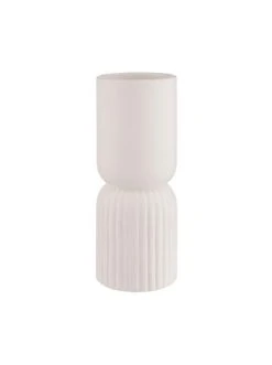 Ganz schön raffiniert: Die moderne Two-Part Vase aus weißem Steinzeug verbindet zwei Vasen in einer und steht bei Bedarf für Ihre Blumen Kopf. Ob Sie die geriffelte oder glatte Seite oben oder unten nutzen, bleibt dabei Ihrem guten Geschmack, Ihrer Lust und Laune überlassen.