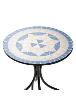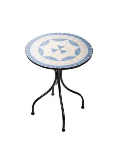 Moment mal: Der romantische Palazzo Tisch aus schwarzem Eisen mit creme-blauem Mosaik (Handarbeit) lädt im Wintergarten, auf der Terrasse oder dem Freisitz zum Cappuccino am Vormittag oder zum Espresso nach dem Essen ein. So viel Zeit muss sein. Weitere Varianten der Serie erhältlich. – Massive Tischplatte mit Mosaik: traditioneller Look – Wetterfeste Ausführung – Typischer Bistrotisch: genau richtig für 2 Personen