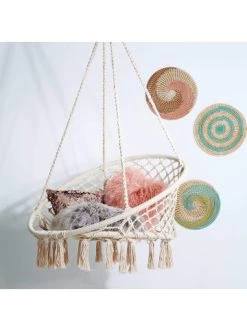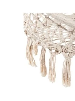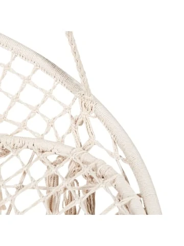 Der Paradise Now Hängesessel greift mit creme-farbener Baumwolle, Makramee-Look und Fransen die lässige Entspanntheit der 70er Jahre auf und übersetzt dieses Lebensgefühl in ein trendiges Wohnstück zum Seele baumeln lassen – z. B. in einem gemütlichen Erker, im lichtdurchfluteten Wintergarten oder draußen auf der Terrasse. – Der runde Hängesesselwirkt mit seinem geflochtenen Design zeitlos und bringt Helligkeit und Leichtigkeit ins Zuhause. – Sie machen es sich in Ihren Wohnräumen, draußen im Garten oder auf dem Balkon richtig gemütlich. – Die Hängesessel schafft locker das Tragegewicht eines Erwachsenen und die geflochtene Baumwolle lässt den Stuhl besonders hochwertig und natürlich wirken. – Der Sitz zum Aufhängen ist aus heller Baumwolle, Polyester und Stahl. – Der Ring des Sessels beträgt Ø 100 cm. Aufgehangen ohne Fransen beträgt die Sesselhöhe 125 cm, mit Fransen 145 cm. Abhängig von der Decken-Aufhängung.