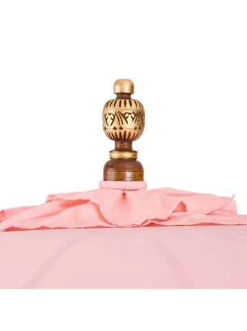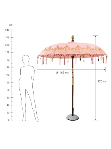 Ein Märchen aus 1000 und 1 Nacht wird wahr beim exotischen Oriental Lounge-Sonnenschirm. Das prachtvolle Schmuckstück ist am Bezug mit Goldapplikationen und Ornamenten versehen, dazu mit Quasten und Dekoherzen aus Aluminium bestückt. Die Schirmspitze wurde aufwändig gestaltet, ebenso der Stab. Innen schaut man auf zu einer Jute-Verkleidung in Makramee-Handarbeit. Bei dieser außergewöhnlichen und wertvollen Aufmachung ist der Schirm natürlich nicht geeignet, um dauerhaft oder bei schlechtem Wetter draußen zu bleiben. In weiteren Varianten erhältlich. Der The Rock-Schirmständer ist separat bei Butlers erhältlich. – Exotischen Oriental Lounge-Sonnenschirm. – Lieferumfang: 1x Oriental Lounge Sonnenschirm – In unterschiedlichen Varianten erhältlich. – Aus 100% Baumwolle, Gestell: Fruchtholz – Höhe 225 cm, Ø 180 cm, Stab: Ø 38 mm