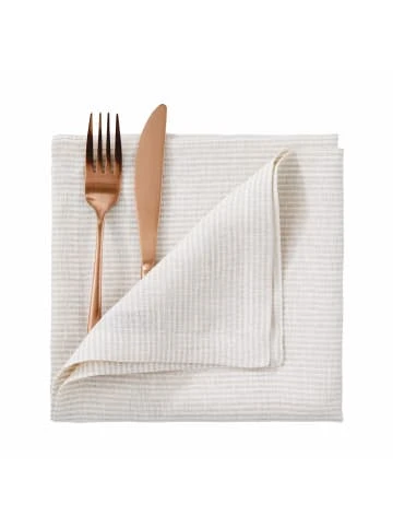 Natürlichkeit und dezente Struktur: Die Schönheit des Naturmaterials Leinen kommt bei der weiß-beige gestreiften Lagos Serviette unaufdringlich zur Geltung. Mit der hochwertigen Stoffserviette veredeln Sie Ihren gedeckten Tisch – vor allem, wenn Sie den authentischen Look bzw. den Skandi Style mit Holz und Geschirr mit reaktiver Glasur lieben.