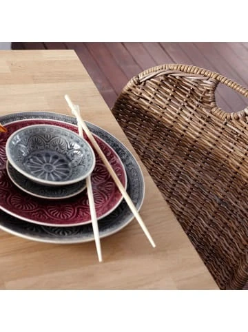 Die prächtigen, asiatischen Sumatra Teller im 4er-Set mit einem Durchmesser von 25 cm und traditionellem Dekor sind handbemalte Unikate mit effektvoll glänzender Glasur in exotischen Farben. Die Speiseteller aus Steinzeug in harmonischen Farben bieten einen echten Blickfang auf Ihrem gedeckten Tisch. Die kostbare Optik der bunten Teller bietet einen sanften Kontrast zu den sehr scharf gewürzten Speisen, die man traditionell auf der Insel Sumatra reicht. – Handbemalte und robuste Keramik in zarter Optik – Kontrast: Glänzende Innenglasur und matte Außenglasur – Fühlbare Reliefstruktur in leuchtenden, harmonischen Farben – Krakelee-Effekt: gesprungene Glasur nach asiatischem Vorbild – Hervorragend kombinierbar für Hochzeit, Festessen, Sommerparty