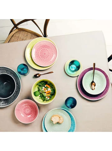 Die prächtigen, asiatischen Sumatra Teller im 4er-Set mit einem Durchmesser von 25 cm und traditionellem Dekor sind handbemalte Unikate mit effektvoll glänzender Glasur in exotischen Farben. Die Speiseteller aus Steinzeug in harmonischen Farben bieten einen echten Blickfang auf Ihrem gedeckten Tisch. Die kostbare Optik der bunten Teller bietet einen sanften Kontrast zu den sehr scharf gewürzten Speisen, die man traditionell auf der Insel Sumatra reicht. – Handbemalte und robuste Keramik in zarter Optik – Kontrast: Glänzende Innenglasur und matte Außenglasur – Fühlbare Reliefstruktur in leuchtenden, harmonischen Farben – Krakelee-Effekt: gesprungene Glasur nach asiatischem Vorbild – Hervorragend kombinierbar für Hochzeit, Festessen, Sommerparty