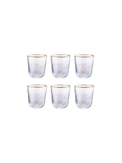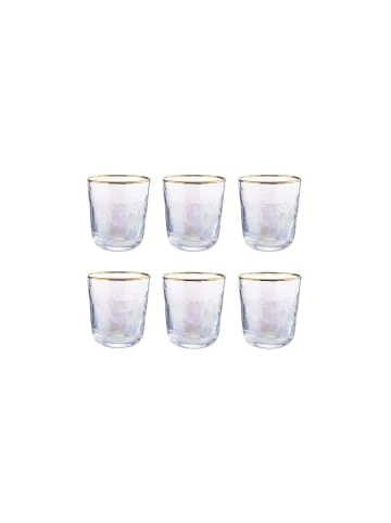 Wie die Perle einer Auster schillert auch das Smeralda Wasserglas im 6er-Set mit Goldrand im zarten Perlmutt und weckt so echtes Fernweh nach Meer und Strand. Aber auch für den Urlaub zuhause ist das transparente Wasserglas mit leichter Oberflächenstruktur ein echter Hingucker. Kombiniert mit typischen maritimen Accessoires, wie Muscheln oder Deko-Fische und phantasievollem Geschirr holen Sie sich das Mittelmeer ganz einfach nach Hause. Zusammen mit den passenden Champagnerflöten und Weingläsern ist der Strand-Look komplett.