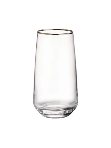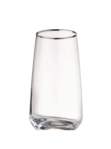 Da passt was rein: In unserem modernen Touch of Silver Longdrinkglas 480 ml im 6er-Set haben auch großzügig eingeschenkte Longdrinks Platz – inklusive einer ordentlichen Portion Eiswürfel. Da sitzen Sie und Ihre Gäste beim Essen und Feiern nicht so schnell auf dem Trockenen. Passendes Wasserglas erhältlich.