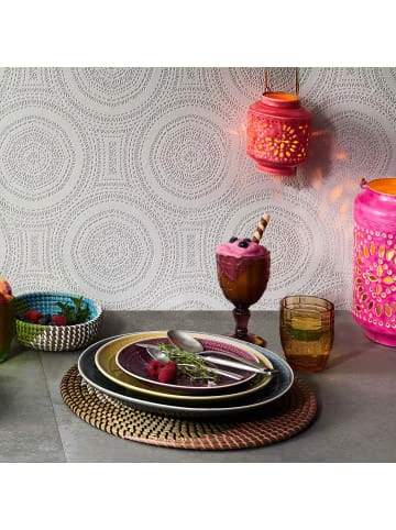 Die kleinen, Sumatra Teller in Grau mit einem Durchmesser von 21 cm und traditionellem Dekor sind ein wundervoll handbemaltes Geschirr-Set mit effektvoll glänzender Glasur und bestens als Teller für Salate oder Desserts geeignet. Die bunten Teller aus Steinzeug im 6er-Set sind ein echter Blickfang auf Ihrem gedeckten Tisch. Die kostbare Optik der bunten Teller bietet einen feinen Kontrast zu den sehr scharf gewürzten Speisen, die man traditionell auf der Insel Sumatra reicht. – Handbemalte und robuste Keramik in zarter Optik – Kontrast: Glänzende Innenglasur und matte Außenglasur – Fühlbare Reliefstruktur in leuchtenden, harmonischen Farben – Krakelee-Effekt: gesprungene Glasur nach asiatischem Vorbild – Hervorragend kombinierbar für Hochzeit, Festessen, Sommerparty