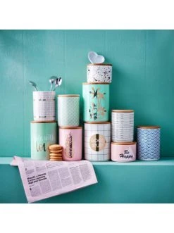 Die Königin unter den Aufbewahrungsdosen heißt Queen it. Optisch regiert das moderne Design mit dekorativem gesprenkeltem Muster, praktisch nimmt der Bambus-Deckel mit Silikondichtung alle möglichen Inhalte schützend unter seine Fittiche. Verschiedene Größen und Varianten erhältlich, die sich prächtig im Badezimmer oder in der Küche, im Regal und auf dem gedeckten Tisch kombinieren lassen.