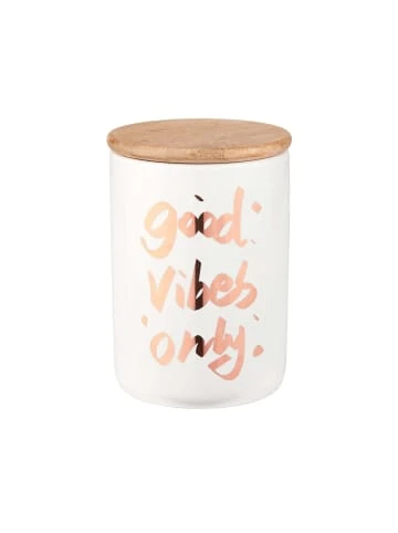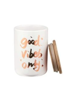 Die Königin unter den Aufbewahrungsdosen heißt Queen it. Optisch regiert das moderne Design mit dekorativem Good-Vibes-Schriftzug, praktisch nimmt der Bambus-Deckel mit Silikondichtung alle möglichen Inhalte schützend unter seine Fittiche. Verschiedene Größen und Varianten erhältlich, die sich prächtig im Badezimmer oder in der Küche, im Regal und auf dem gedeckten Tisch kombinieren lassen. – Praktisch schützt die Dose ihre Inhalte – QUEEN IT Aufbewahrungsdosen sind ideal – Weitere Varianten erhältlich – Ø 10 cm, Höhe 14 cm, Füllmenge: 700 ml – Aus Dolomit, Bambus und Silikon