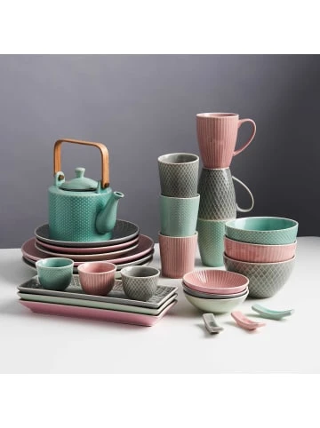 In sanften Pastelltönen und ostasiatischem Flair ist dieser Teller aus Steinzeug in Mint ein Glanzstück auf Ihrem Esstisch und Kaffeetisch. Der kleine Salatteller der Hanami-Serie ist ein echter Hingucker, der in unterschiedlichen Farben mit anderen Teilen kombiniert werden kann und als Kuchenteller und Dessertteller, das Lieblingsstück auf Ihrem gedeckten Tisch wird. Hier setzen Sie süße Naschereien in Szene und nutzen den bunten Teller auch als Dekoelement. – Besonders robust und hitzebeständig – Krakelee-Effekt: gesprungene Glasur nach asiatischem Vorbild – Feines Muster in japanischem Design – Pastelltöne für harmonische Kombinationen – Perfekt für ein sommerliches Ambiente
