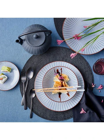 Das 12-teilige asiatische Dim Sum Geschirr-Set mit dem Flair Japans und Koreas ist ein dekoratives Service für vier Personen, aus Speisetellern, kleinen Tellern und Servierschalen mit typisch klarer Form sowie modernen und kontrastreichen grafischen Mustern. Mit diesem Tafelservice genießt auch das Auge, während Sie Ihre Geschmacksknospen zu kulinarischen Abenteuern nach China, Japan oder Vietnam entführen. Das Geschirr ist ein absolutes Highlight und schmückt jede Tafel. – Glänzende Keramik mit Muster in kunstvoller Symmetrie – Hitzebeständig, robust und edel – Harmonie: Beruhigende Gleichmäßigkeit für positive Feng Shui Energie – Modern Asia Design kombiniert mit schlichtem Clean Living – Stilvolles Ambiente für besondere Anlässe