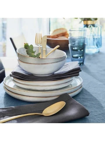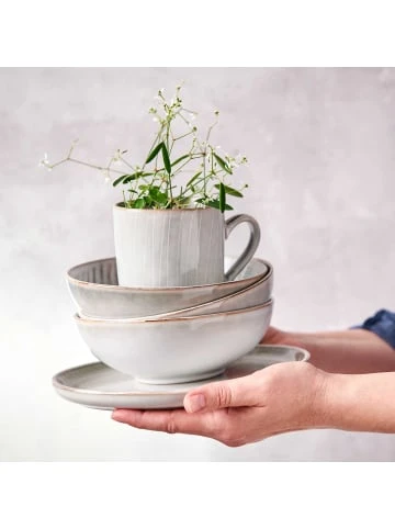Im Spiel zwischen feiner Sprenkelung, zarter Linienführung und klassisch-robustem Steinzeug bringt das 12-teilige Frühtücksset der Henley-Serie Qualität auf den Tisch. Das Set aus jeweils vier Tassen, Schalen und Tellern ist hervorrgend geeignet um den ganzen Tisch im beliebten Landhausstil einzudecken. Das Steinzeug-Geschirr der Henley-Reihe verfügen über eine sanfte Riffelung die jedes Stück zum Unikat macht und so den Tellern, Tassen und Schalen einen ganz individuellen Charme verleiht. – Hochwertige Keramik: Robust und hitzebeständig – Jedes Teil ein Unikat: Natürliche Unterschiede bei der Farbgebung – Reaktive Glasur: Jedes Teil ein Unikat, durch Unterschiede bei der Farbgebung – Ein natürlicher Look mit Charme und Charakter – Im Trend: Skandinavisches Design – Geeignet für jeden Anlass durch schlichte und solide Machart