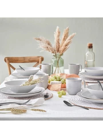 Handgetöpferter, natürlicher Look und zeitlose Farbgebung: Mit unserer Geschirrserie Manor in organischen Formen und klaren Farben bringen Sie den modernen Landhausstil auf Ihren gedeckten Tisch. Dabei besticht die Serie – wie hier das formschöne 16-teilige Geschirrset – mit naturverbundenem Charme, der sich auch hervorragend mit anderen Stilen kombinieren lässt. Durch die reaktive Glasur entsteht zudem ein besonderer Farbverlauf, der jedes Teil der Serie zum echten Unikat macht. Die hochwertige Verarbeitung sorgt überdies dafür, dass Manor das perfekte Geschirr für den täglichen Gebrauch ist. – Reaktive Glasur: Jedes Teil ein Unikat, durch Unterschiede bei der Farbgebung – Robustes Steinzeug – Im Trend: Vintage-Look – Moderner Landhausstil – Für den täglichen Gebrauch – Geschirrspülmaschinen- und mikrowellengeeignet