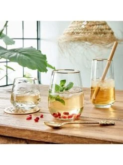 Ob zum Kaffee oder zum Wein: Ein Glas frisches Wasser in einem Touch of Gold Glas mit goldenem Rand ist immer ein gern gesehener Begleiter. Es löscht den ersten Durst und neutralisiert den Geschmackssinn, so dass man sich besser auf die feinen Aromen eines guten Espressos oder edlen Tropfen konzentrieren kann.