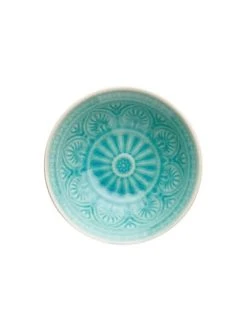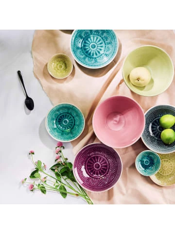 Scharfe Gewürze und kräftige Aromen passen besonders gut zu dieser exotischen Serie aus eleganten, kleinen Schalen, Speise- und Desserttellern aus Steinzeug. Jedes Stück erzählt seine eigene Geschichte und das traditionelle Reliefdekor hebt sich optisch sanft unter der glatten Glasur der bunten Schale ab. Die Speiseschale bietet einen sanften und doch intensiven Blickfang auf Ihrem gedeckten Tisch und lässt südostasiatischen Flair aufkommen. – Handbemalte und robuste Keramik in zarter Optik – Kontrast: Glänzende Innenglasur und matte Außenglasur – Fühlbare Reliefstruktur in leuchtenden, harmonischen Farben – Krakelee-Effekt: gesprungene Glasur nach asiatischem Vorbild – Hervorragend kombinierbar für Hochzeit, Festessen, Sommerparty