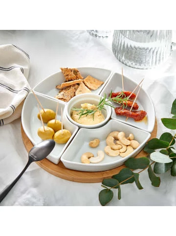 Oliven, Nüsse, Cracker und Dips bringen Sie mit dem Appetizer Snackschalenset formvollendet auf den Tisch. Die kleinen Schälchen aus Porzellan lassen sich zum Aperitif oder zum Fernsehabend lecker füllen – und anschließend einfach in der Spülmaschine reinigen. Das passende Tablett ist aus Bambus gefertigt, einem schnell nachwachsenden Rohstoff aus der Natur.
