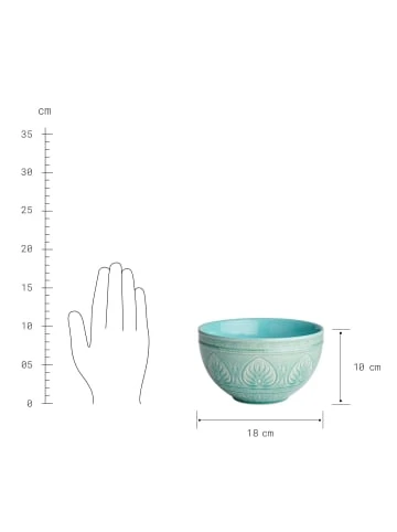 Scharfe Gewürze und kräftige Aromen passen besonders gut zu dieser exotischen Sumatra Schalen aus Steinzeug. Das traditionelle Reliefdekor hebt sich optisch sanft unter der glatten Glasur der großen, bunten Schale ab. Die Suppenschale bietet einen echten Blickfang auf Ihrem gedeckten Tisch und lässt südostasiatischen Flair aufkommen. – Handbemalte und robuste Keramik in zarter Optik – Kontrast: Glänzende Innenglasur und matte Außenglasur – Fühlbare Reliefstruktur in leuchtenden, harmonischen Farben – Krakelee-Effekt: gesprungene Glasur nach asiatischem Vorbild – Hervorragend kombinierbar für Hochzeit, Festessen, Sommerparty