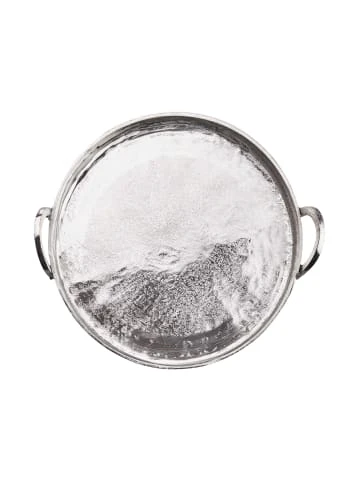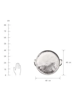 Mit dem runden Banquet Deko Tablett mit Griffen aus Aluminium in Silber schaffen Sie die elegante Grundlage für Ihre individuelle Deko: Einfach Kerzen, Windlichter, Vasen und andere ausgesuchte Objekte auf dem Tablett anordnen und dann auf einem Beistelltisch oder auf dem Esstisch platzieren. Auf der festlich gedeckten Tafel macht sich das Dekotablett mit 40 cm Durchmesser auch gut als Untersetzer für Flaschen und Karaffen. Mit Filzpunkten an der Unterseite zum Schutz empfindlicher Möbel.
