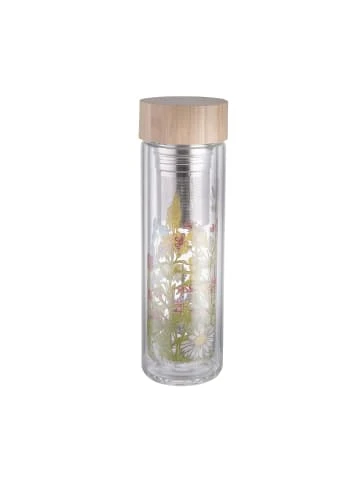 Tea to go in seiner schönsten Form: Die designige Tea Tender Teeflasche mit Blumendruck aus robusten Borosilikatglas bringt mit Edelstahlsieb und Holzverschluss alles mit, was Sie für die Zubereitung und den Transport Ihres Lieblings-Tees oder Infused Waters brauchen.