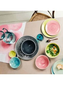Der prächtige, asiatische Sumatra Teller mit einem Durchmesser von 31 cm und traditionellem Dekor ist ein handbemaltes Unikat mit effektvoll glänzender Glasur. Der große Speiseteller aus Steinzeug ist ein echter Blickfang auf Ihrem gedeckten Tisch. Die kostbare Optik des bunten Tellers bietet einen feinen Kontrast zu den sehr scharf gewürzten Speisen, die man traditionell auf der Insel Sumatra reicht. – Handbemalte und robuste Keramik in zarter Optik – Kontrast: Glänzende Innenglasur und matte Außenglasur – Fühlbare Reliefstruktur in leuchtenden, harmonischen Farben – Krakelee-Effekt: gesprungene Glasur nach asiatischem Vorbild – Hervorragend kombinierbar für Hochzeit, Festessen, Sommerparty