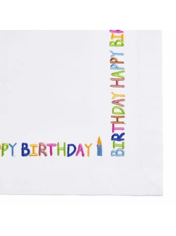 Wer Geburtstag hat, darf sich verwöhnen lassen – mit Glückwünschen, Aufmerksamkeiten und einer fröhlichen Dekoration. Dieser leichte Tischläufer aus reiner Baumwolle ist umlaufend bunt bestickt: mit den Wörtern „Happy Birthday“, kleinen Blumen, Kerzen, Sternen, Monden und Geschenken. Apropos Geschenke: Die lassen sich perfekt auf dem Tischläufer präsentieren, am besten direkt neben der Geburtstagstorte. Übrigens: Zu diesem Tischläufer sind passende Servietten erhältlich. – Geburtstag – Spruch – Motiv – Geburtstagsfeier – Kindergeburtstag – Klassisch – Zeitlos