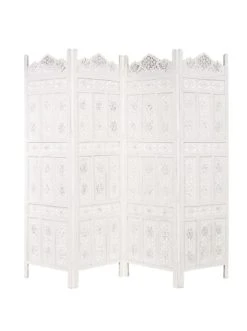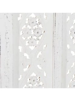 Als stamme er aus einer spanischen Finca, einer italienischen Villa oder einer portugiesischen Posada: Unser weißer Estella-Paravent mit femininen Ornamenten versehen, präsentiert sich charmant nostalgisch und aufwändig gearbeitet. Mit Liebe für das Detail. Denn er wurde von Hand gefertigt und bemalt. Ob als Raumteiler, als Sichtschutz oder Dekoelement: Der Paravent im Vintage-Look ist vielseitig nutzbar und weist deutliche Gebrauchsspuren auf. – Ein Paravent wie aus einer spanischen Finca – Nostalgischer, aufwändig gearbeiteter Raumtrenner – Auch als Sichtschutz oder Dekoelement nutzbar – Von Hand gefertigt Vintage-Look Gebrauchsspuren – Mangoholz weiß Breite 203 x Tiefe 2 x Höhe 182 cm
