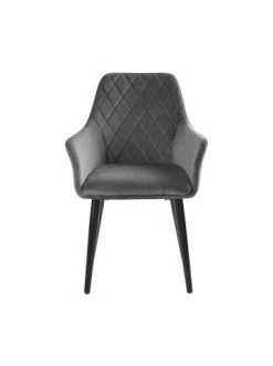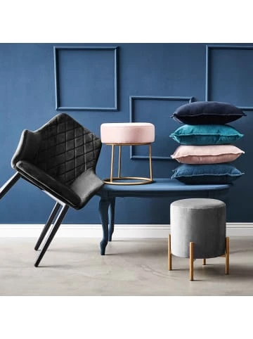 In edler Samt-Optik präsentiert sich unser Velvet-Stuhl. Die hochwertigen Rücken- und Armlehnen bieten höchsten Komfort und gewährleisten einen bequemen Sitz. Abgerundet wird das Design durch das Muster in der Rückenlehne und die nach unten hin zulaufenden Metallbeine, die in matter Optik einiges hermachen. Dieses Möbelstück lässt sich zudem problemlos kombinieren und eignet sich optimal für das Wohn-, Ess-, oder Schlafzimmer. – Hochwertige Verarbeitung – Hoher Sitzkomfort: Weicher, Samtbezug – Ansprechendes Design – Edle Optik